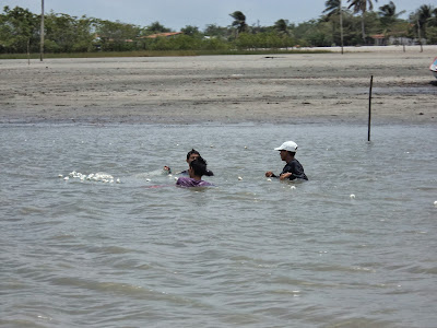 Passamos por várias cidades até chegar em Marudá, onde embarcamos para a Ilha do Algodoal, fomos num popopô, e pagamos R$ 7,00 por pessoa, uns 40 minutos naquele mar agitado, barrento, mais parecendo um rio por causa de sua cor. Tomamos alguns banhos com aquelas ondas... Tá, eu confesso que tomei um Plasil junto com a Marina, com medo de enjoar (eu sempre fiquei mareada na água), me deu um sono, mas uma onda me pegou em cheio e acordei na hora! Achei até que pegaríamos chuva, porque ventava demais, mas chegando lá percebi que o vento (que tinham me dito que era um ventinho leve) é bem forte e constante! Característica do lugar! A gente se acostuma...